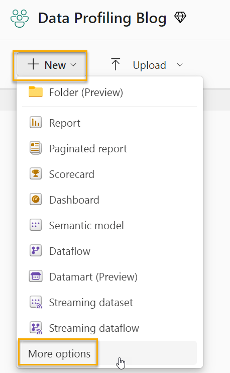 In either approach, the first step will be to create a Lakehouse. Go to a Fabric Workspace where you have appropriate access and click on “new”, and then “more options”: