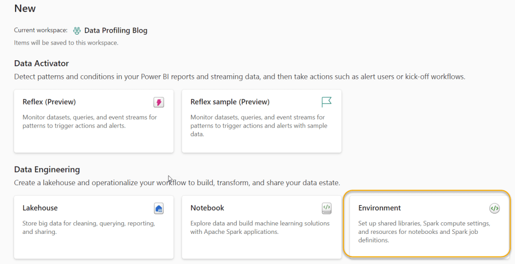 Before we can use the ydata-profiling Python library, we need to make it available to for our Fabric Notebooks. To do this, we need to create a new Fabric Environment.