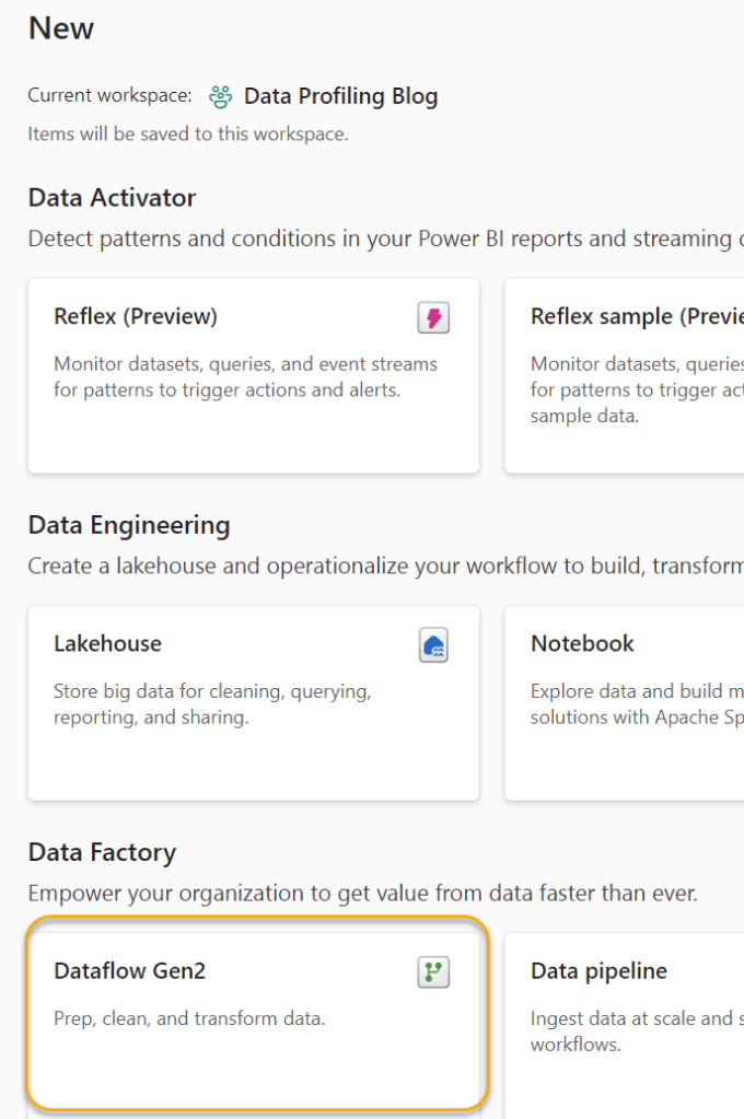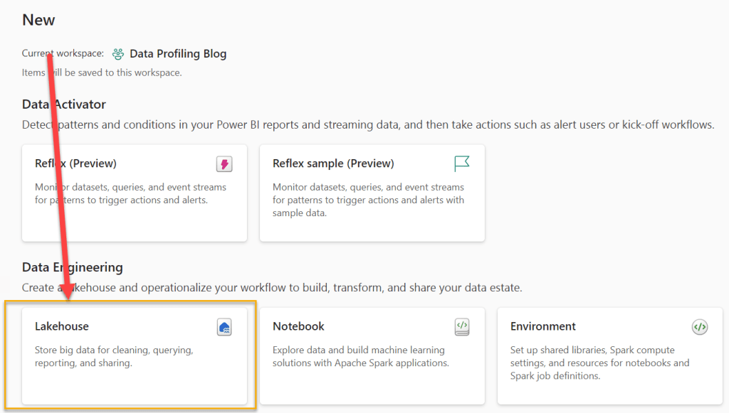 I will call the Lakehouse “Data_Profiling”.