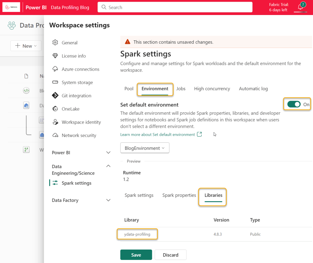 - Create an Environment and make the ydata-profiling Python library available to any Fabric Workspace which needs it.