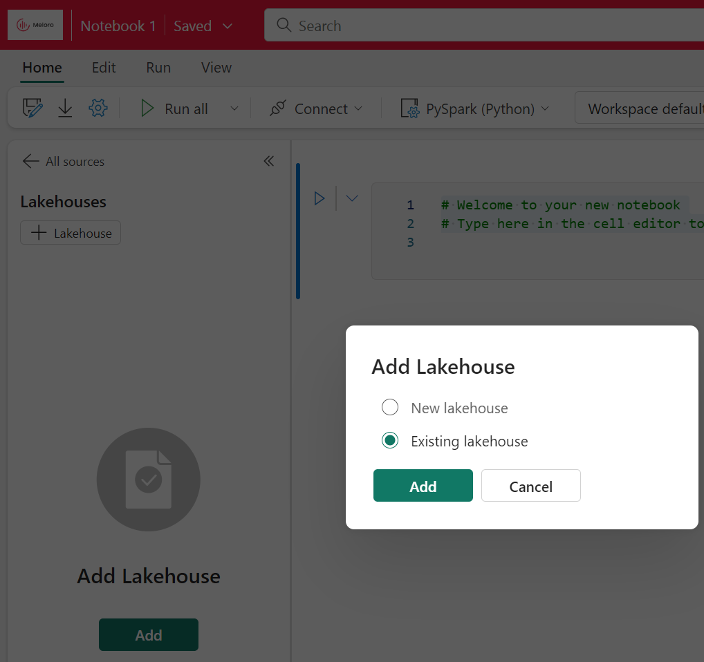 Our first task is to link the Notebook to our Lakehouse. Click “Lakehouses” and then “Add”, then “Existing Lakehouse”