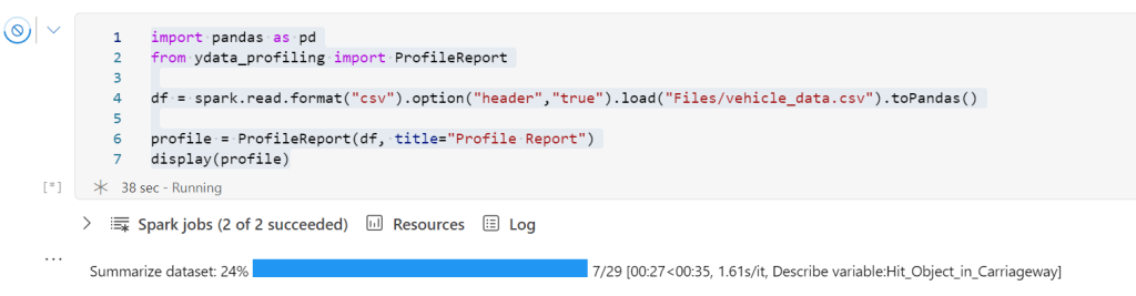 We will now load the data from our vehicle_data.csv file into a Dataframe in our Notebook. Our ydata-profiling library wants the data to be in a Pandas dataframe. However, with my example file, I get errors when loading using Pandas initially, so I am loading initially using Spark.