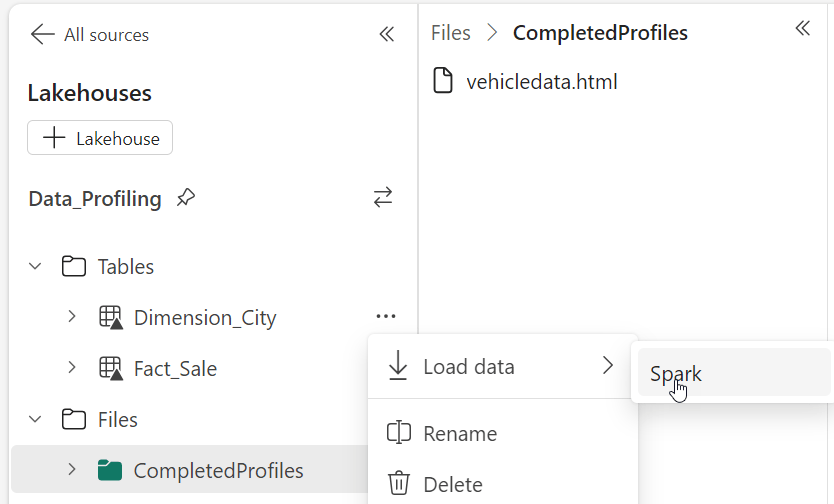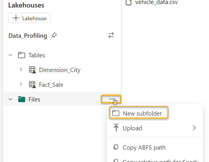 We now have tables from our SQL database to profile, and we have a large CSV file of Vehicle data to profile in the “Files” section of our Lakehouse.