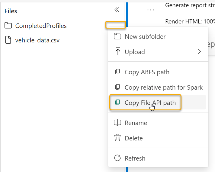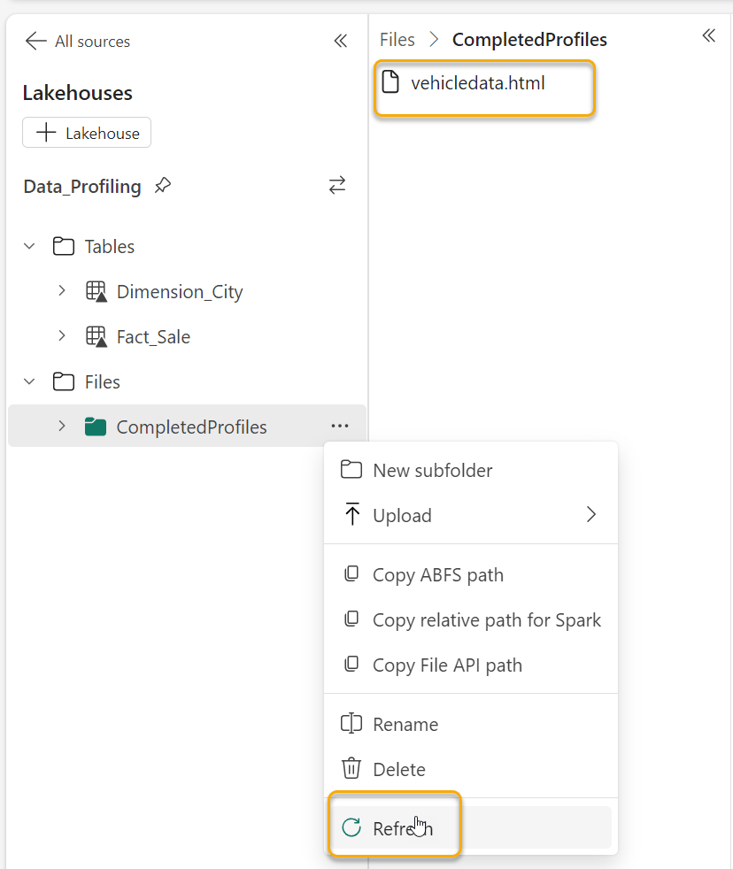 - Output the profile to an .html file and save it on your Fabric Lakehouse in the Files section.