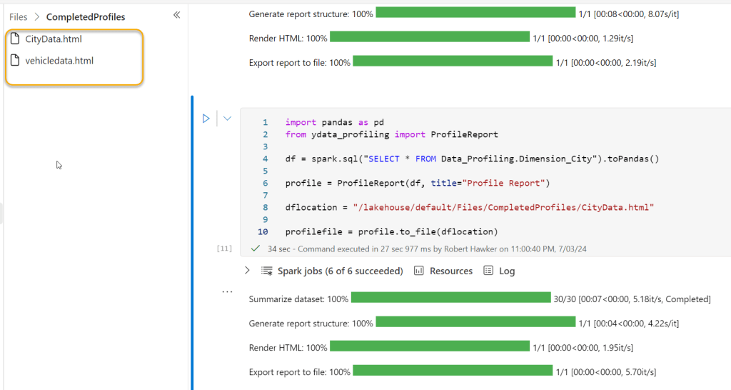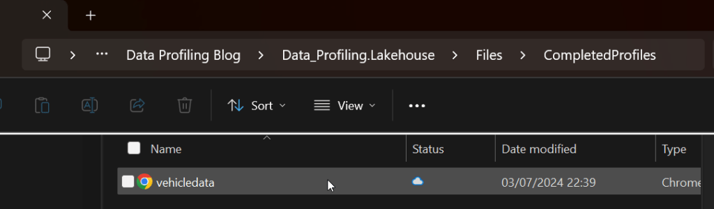 The final step is to save the profile into an .html file. This is useful because you can view it later in a Browser (e.g. Chrome/Edge). We can save this into the Fabric Lakehouse “Files” section. I created a folder in the “Files” section called “CompletedProfiles” to hold the html files.