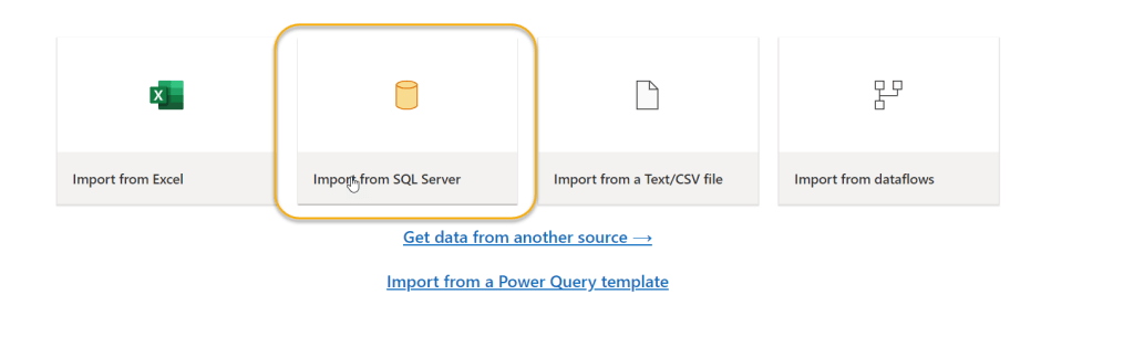 As my source is an Azure SQL database, I will select Import from SQL Server. I will then input the server and database details: